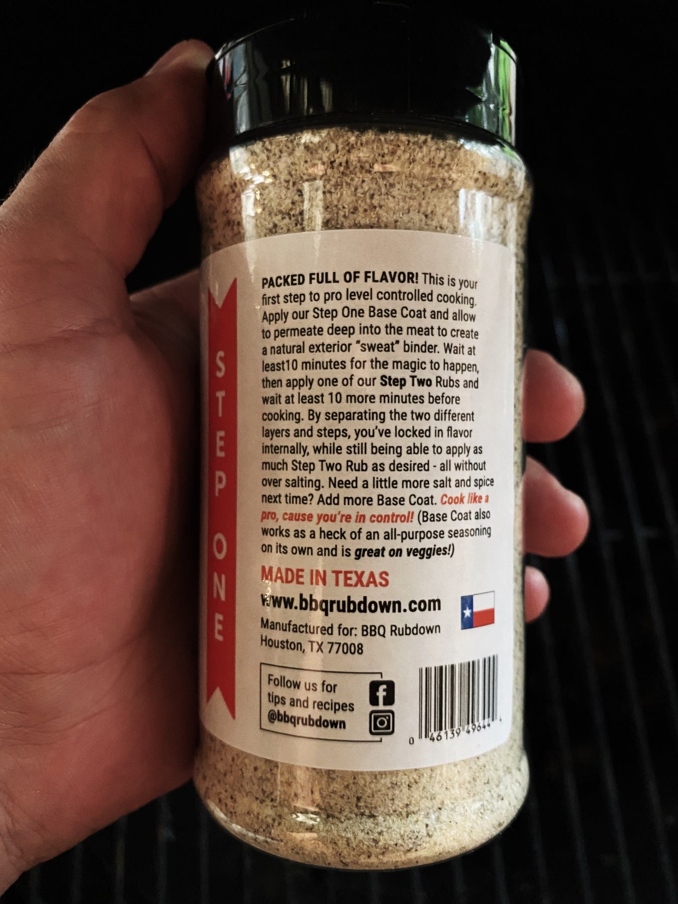 This is your first step to pro level controlled cooking. Apply our Step One Base Coat and allow to permeate deep into the meat to create a natural exterior “sweat” binder. Wait at least 10 minutes for the magic to happen, then apply one of our Step Two Rubs and wait at least 10 more minutes before cooking. By separating the two different layers and steps, you’ve locked in flavor internally, while still being able to apply as much Step Two Rub as desired - all without over salting. Need a little more salt and spice next time? Add more Base Coat. Cook like a pro, cause you’re in control! (Base Coat also works as a heck of an all-purpose seasoning on its own and is great on veggies!)
